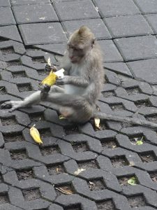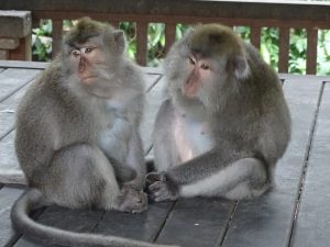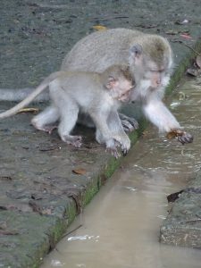 Besuch des Monkey Forstest in der Nähe von Ubud. Freche Kerle im Muskatbaumwald. Pura Buki Sari ist der Meditationsrempel im Zentrum des Affenwaldes. Lustig aber auch ein wenig zurückhaltend unsererseits.