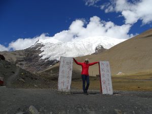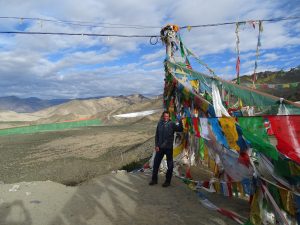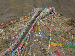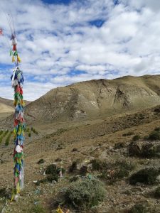 Soooooooo viele Gebetsfahnen erwarten uns am Kora La Pass mit 5039 Meter. Dahinter der Nenying Kang mit 7190 Meter.