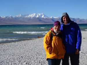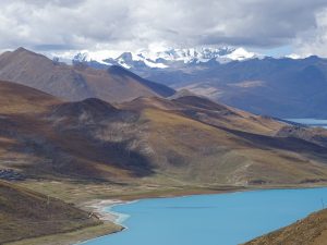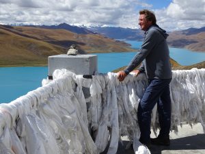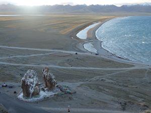 Nach 9 Stunden Fahrt erreichen wir die Halbinsel Tashidor und den Namtso Lake. Er liegt auf einer Höhe von 4718 Meter. Es ist bitterkalt. Im Hintergrund sehen wir den Nyenchen Tangla mit 7160 Metern.