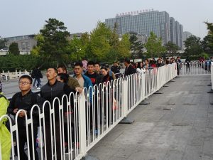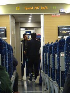 Heute schreiben wir den 16. Oktober 2017. 6:30 Frühstück, danach fahren wir mit der Subway zum Bahnhof und werden von den Lehrerkollegen Stefan und Joe begleitet. Mit dem Schnellzug geht es nun nach Bejing. In sechs Stunden Fahrzeit legen wir ca 1000 Kilometer zurück. Die Reisegeschwindigkeit beträgt beachtliche 300 km/h. Trübes Wetter von X’ian bis Bejing.