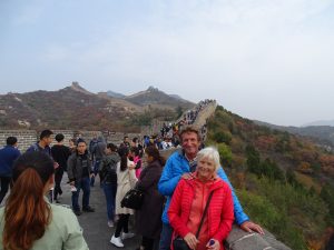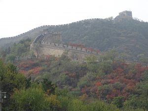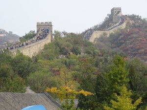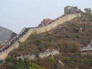 Bei schönem Herbstwetter wandern wir auf der großen Mauer acht Türme weit auf der Nordseite, inmitten einer Menschenmenge. Die chinesische Mauer schützte das Kaiserreich vor nomadischen Reitervölkern. Mit dem Bau wurde im 7. Jhdt. v. Chr. begonnen, die Mauer ist ca 8800 Kilometer lang. Es ist größte Bauwerk der Welt, das vom Mond aus gesehen werden kann. Tolles Erlebnis!
