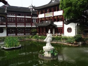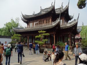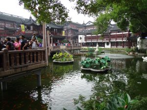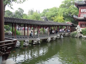 Über die Brücke geht es weiter zum YU Yuan Garten, vorbei am Teehaus.