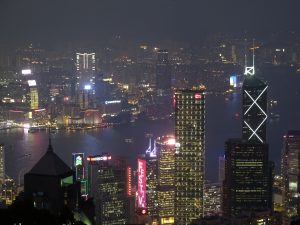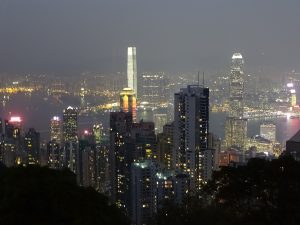 Skyline in der Nacht vom Viktoria Peak auf Hong Kong Island und Kowloon.