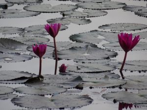 Angkor Wat mit seinen fünf Türmen und Seerosenteich.