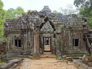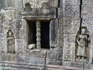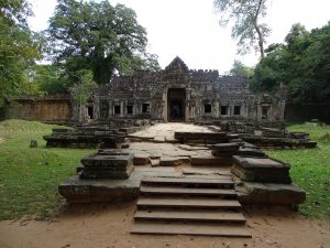 Beim Eingang zum Preah Khan begrüßen sich zwei steinerne Wächter. Der Tempel ist ein Flachbau mit vielen verwirrenden Hallen und Gängen.