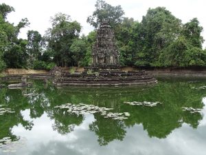 Der Tempelturm- Prasat- des Neak Pean ist 14m im Durchmesser und wird von zwei sich ineinander gewunden Schlangen getragen.