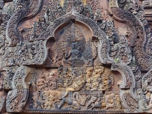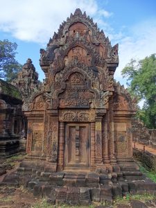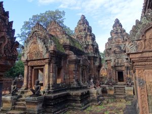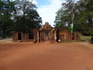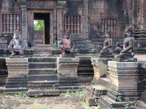 Wir verlassen die Tempelanlage Angkor und fahren ca. 40 Kilometer mit Tuktuk Richtung Norden. Unser Ziel: Banteay Srei- „Zitadelle der Frauen“- bzw. „Zitadelle der Schönheit“. Er ist einer der kunstvollsten Tempel Aufgrund seiner vielfältigen feinen Verzierungen. Auch gut erhaltene Gruppen von Menschenaffen sind zu sehen.