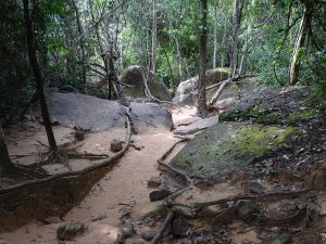 Der Weg zum Kbal Spean beginnt mit einem Marsch steil bergauf durch den Dschungel, eine schweißtreibende Angelegenheit.