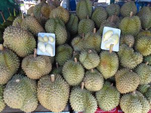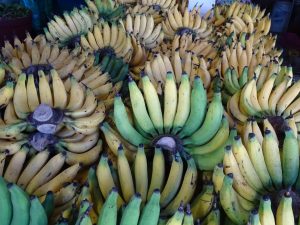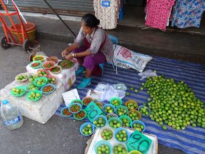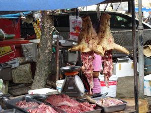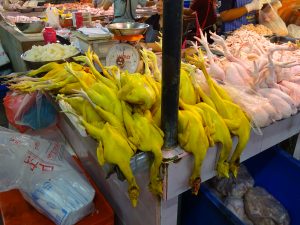 Buntes treiben am Markt. Köstliche Früchte, Huhn und Fisch.