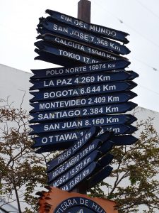 Wegweiser am Ende der Welt. Bunte Häuser bringen Farbe in das graue Ushuaia.