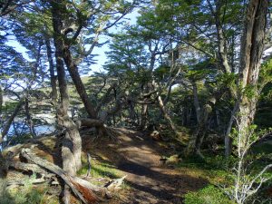 Es ist bitterkalt, der Wind pfeift uns um die Ohren. Wir gehen los und folgen immer den gelben Markierungen. Zunächst entlang des Beagle Kanals dann steigen wir höher durch dichten Wald. Die Bäume sind dicht mit Moos bewachsen.