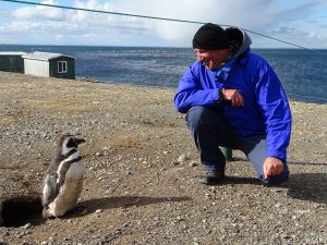 Gespräch mit einem Pinguin. Auf der Nachbarinsel beobachten weitere Pinguine, Möven und Seelöwen.