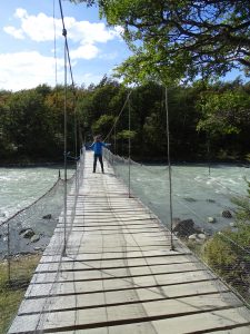 Der Weg zum Lago Grey führt über eine Hängebrücke. Im See treiben riesige Eisschollen vom Grey-Gletscher.