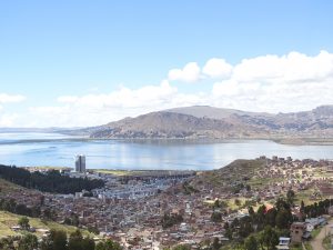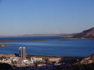 Erster Blick auf den Titicacasee mit Puna. Die Grenze zwischen Peru und Bolivien auf einer Höhe von 3812 Meter liegt Mitten im See. Er ist bist zu 300 Meter tief und das höchstgelegene schiffbare Gewässer der Welt. Kalt! 12°C.