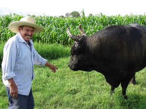 Wil mit einem seiner Pferde. Zuchtbulle für den traditionellen Stierkampf in Arequipa.