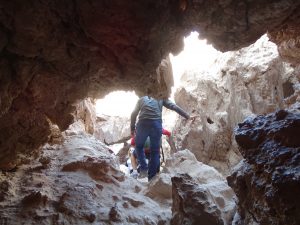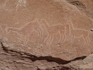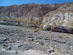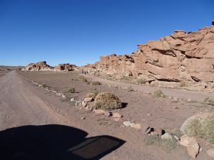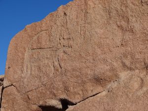 Am Eingang zum Nationalpark: Valle del Arcoiris – Tal der Regenbogenberge, besteigen wir einen Felsen. Hier haben die Ureinwohner Botschaften hinterlassen. In geritzten und gemeisselten Tierreliefs sehen wir Lamas, Füchse und Flamingos.