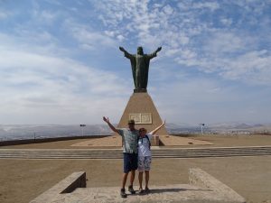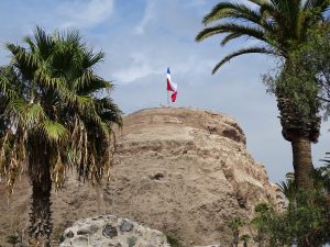 Zu Fuß, mit gutem Sonnenschutz ausgestattet erreichen wir den Aussichtsberg El Morro de Arica. Die riesige Fahne lässt Josef wie eine Ameise erscheinen, wer findet ihn?