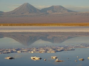 Abendstimmung am Salzsee mit Planetarium Alma und Vulkan. Salzschollen treiben im See.
